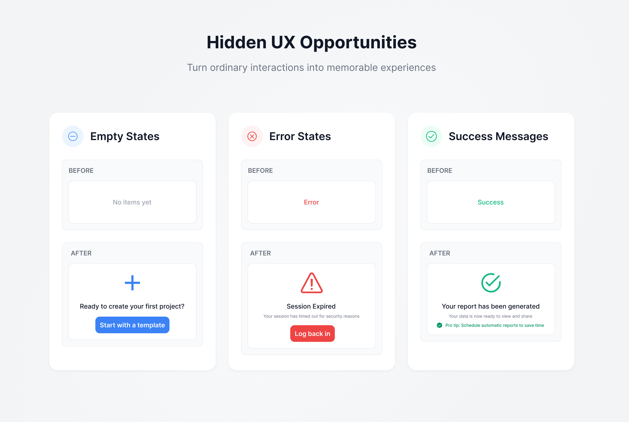 After: Celebrate completion with "Your report has been generated" while suggesting valuable next steps: "Pro tip: Schedule automatic reports to save time"